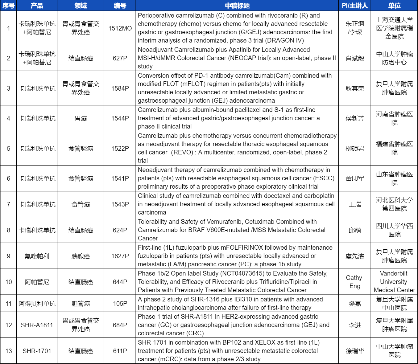 在消化系统肿瘤领域,AG庄闲创新产品相关研究共入选1项口头报告和12项壁报展示。除了经典的明星药物卡瑞利珠单抗和阿帕替尼,SHR-A1811、SHR-1701等未上市创新产品也有相应研究入选。此外,阿得贝利单抗、氟唑帕利等已上市药物也在积极探索新的适应症,本次ESMO大会分别有肝内胆管癌和胰腺癌相关研究入选。这些新老药物前沿研究的不断出现,有望为消化系统肿瘤患者带来新的福音!