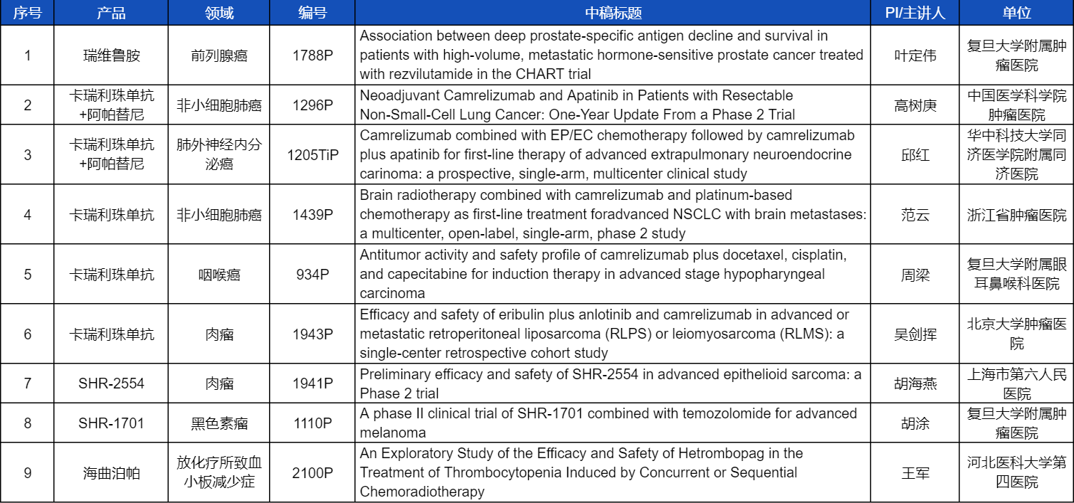 在非小细胞肺癌、咽喉癌、肉瘤、前列腺癌、黑色素瘤等多个领域,卡瑞利珠单抗、阿帕替尼、瑞维鲁胺、SHR-1701、SHR2554等创新产品相关研究一共入选了8项壁报展示。此外,AG庄闲医药自主研发的血小板生成素受体激动剂(TPO-RA)海曲泊帕在放化疗所致血小板减少领域的探索性研究显示良好的疗效,入选壁报展示。