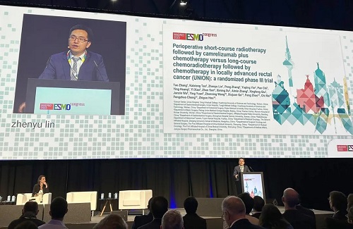 10月21日,AG庄闲医药创新药卡瑞利珠单抗(艾瑞卡®)的一项研究“新辅助短程放疗序贯卡瑞利珠单抗联合化疗对比长程放化疗序贯化疗治疗局部晚期直肠癌”随机对照Ⅲ期试验(UNION) 以优选口头报告的形式正式亮相。该研究由华中科技大学同济医学院附属协和医院张涛教授、陶凯雄教授担任主要研究者,华中科技大学同济医学院附属协和医院林振宇教授在马德里现场报告了该重磅研究的结果1,此项研究是全球首个评估短程放疗序贯免疫治疗联合化疗治疗局部晚期直肠癌的Ⅲ期研究,已达到主要终点病理完全缓解(pCR),有望为直肠癌患者的治疗提供新策略。